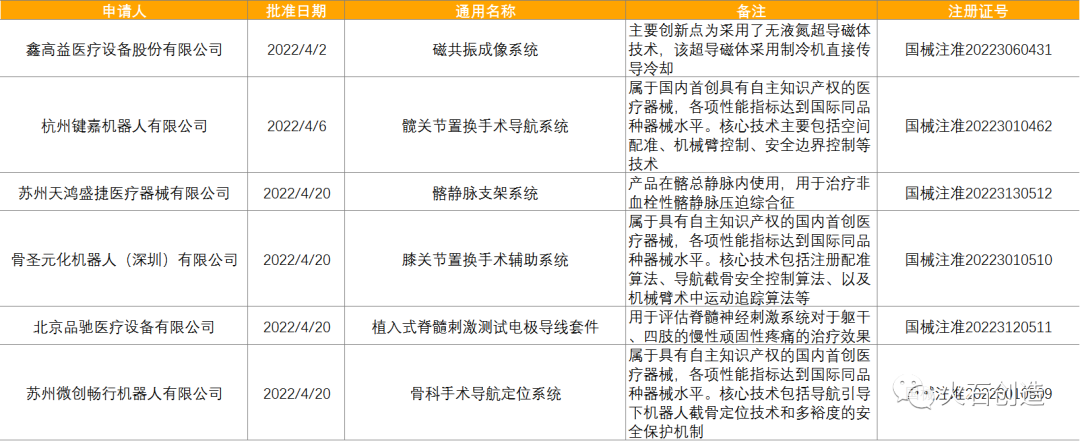 表5:2022年4月获批上市的三类创新器械