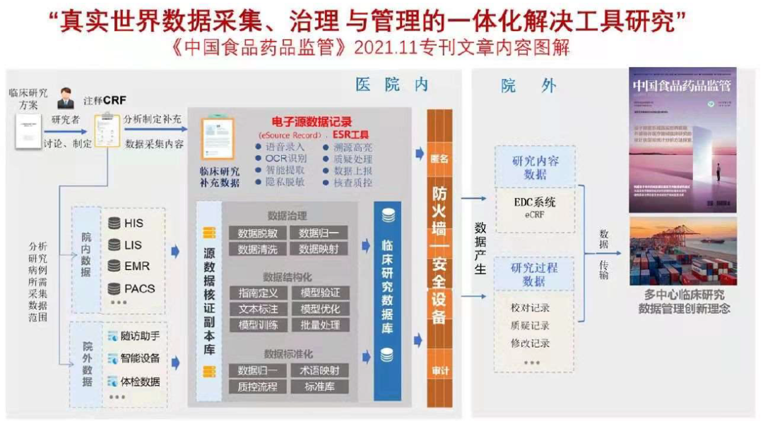 2021年底,《中国食品药品监管》杂志与海南省真实世界数据研究院共建的“真实世界数据研究与药械监管创新”专刊出版,系统介绍了海南博鳌乐城真实世界数据研究成果及案例。其中值得关注的是,姚晨教授团队基于真实世界数据的产生和应用场景,以及满足监管部门的法规要求,构建了一个用于“真实世界数据采集、治理和管理的一体化解决工具”,即电子源数据记录(eSource record,ESR)工具,功能设计主要包含源数据采集、数据提取和治理以及电子数据采集系统对接三部分。如下图所示,将ESR工具应用于多中心临床研究的数据管理创新理念可以类比于当下采用了标准规格的集装箱,让全球的货物可以在世界各地的集装箱码头实现自动化运输和管理。
