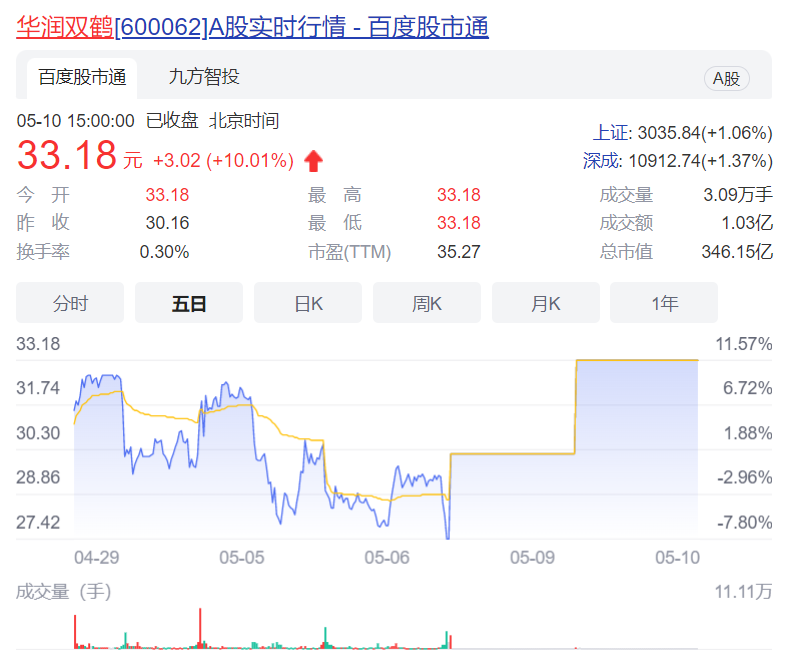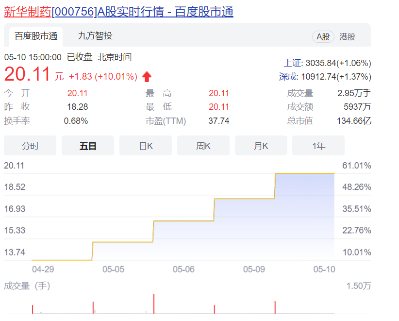 5月10日,华润双鹤、新华制药再次一字涨停。截至收盘时,华润双鹤报收于33.18元,总市值346.15亿;新华制药报收于20.11元/股,总市值134.66亿。