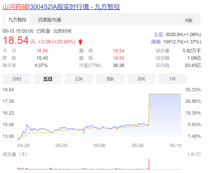 另一边,傍上“新冠口服药”的企业股价都在腾飞。5月9日晚间,山河药辅在电话交流会中透露,在新冠口服药相关项目方面,公司目前正在合作的有开拓药业的普克鲁胺和君实生物在研口服药,还有3-5家尚未进入临床后期阶段的也在与其合作。5月10日,山河药辅开盘涨停。