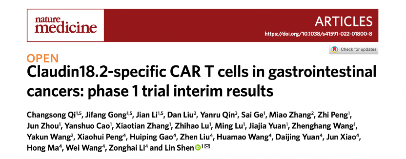 2022年5月9日,沈琳教授团队在国际权威学术期刊《自然-医学》(Nature Medicine)在线发表题为“Claudin18.2-specific CAR T cells in gastrointestinal cancers: phase 1 trial interim results”论文。该研究探索了靶向Claudin18.2 CAR-T在消化系统肿瘤中的疗效和安全性,是第一个针对Claudin18.2靶点的细胞免疫治疗系统性的I期临床研究,是CAR-T细胞治疗实体瘤的突破性进展,亦对后续CAR-T细胞治疗实体瘤研究具有很高的借鉴价值。