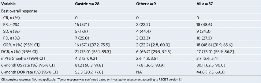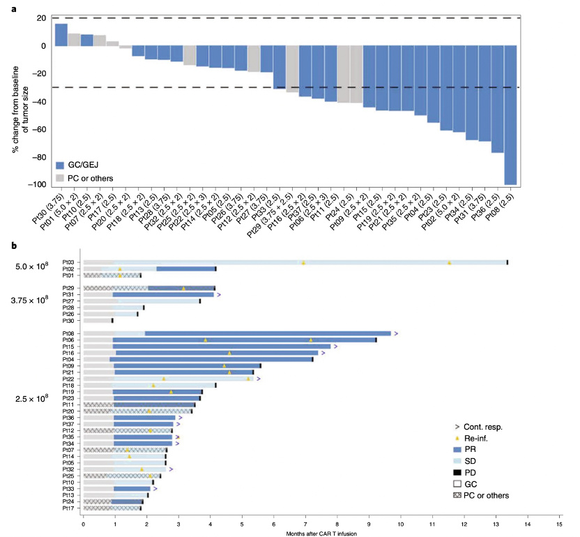 在报告的37例晚期消化道肿瘤患者中有28例是胃癌/胃食管交界处腺癌、5例胰腺癌(PC)和4例其他消化系统肿瘤。所有入组患者均已发生远处转移,其中50%患者远处转移累及至少3个器官,且全部是常规治疗失败的患者。所有患者的客观缓解率(ORR)和疾病控制率(DCR)分别为48.6%(95%CI,31.9,65.6)和73.0%(95%CI,55.9,86.2)。其中28例胃癌/胃食管交界处腺癌患者中,42.9%患者为印戒细胞癌, 57.1%患者Lauren分型为弥漫型或混合型, 42.9%既往接受过抗PD-1/PD-L1单抗治疗,18例既往至少2线治疗失败的胃癌患者接受2.5 × 108 CAR-T细胞治疗,ORR为61.1%,DCR为83.3%,mPFS为5.6个月(95%CI,2.6,9.2)。安全性分析也显示该CAR-T细胞治疗副反应整体可控,有望为后线胃癌患者提供更好治疗选择。
