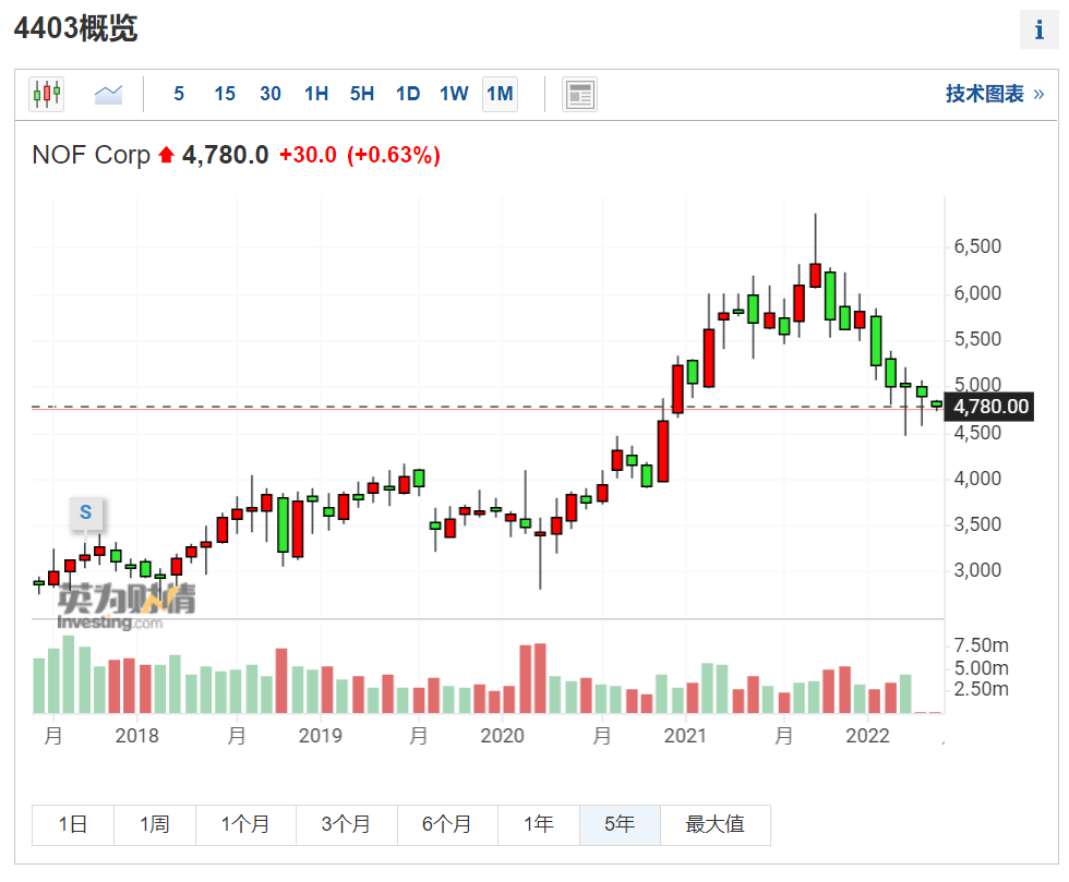 过去5年,日本NOF公司一直处于不增长的状态(毛利率36%、净利率15%),市盈率在13倍左右,但股价依然在一定时间内实现了翻倍。