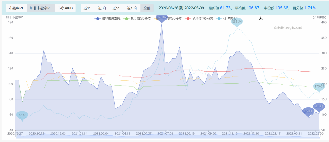 键凯科技股价去年12月以来经历了大幅回调,市值目前处于100亿左右。整体的扣非市盈率水平已经下到历史低位,2022动态市盈率在40倍。