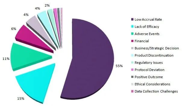 申办方开启一项临床试验不容易,提前终止更不容易,除非万不得已。那么,申办方终止临床试验的缘由都有哪些呢?2018年,国际知名研究和咨询公司GlobalData分析了临床试验数据库中的所有被终止的临床试验,以确定背后的主要原因。这些原因包括:(1)临床试验的入组率低;(2)临床研究没有达到预设的疗效指标;(3)试验过程中出现包括患者死亡等不良事件;(4)财务问题,导致公司无法继续推进临床研究;(5)公司基于商业战略决策决定终止临床研究;(6)临床试验所研究的产品被停产;(7)监管方面的问题导致临床终止;(8)临床研究方案偏离;(9)临床试验结果积极,决定终止试验;(10)出于伦理考虑,决定终止试验;(11)数据收集困难,临床研究出现重大偏差和问题,难以为继;(12)其它原因;(13)未指定的原因。当从数据集中删除“其它原因”和“未指定的原因”后,终止试验的最高原因是受试者入组率低,占比55%,随后的是缺乏疗效 (15%)、不良事件 (11%)、财务问题 (6%)。