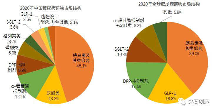 图3:2020年中国与全球糖尿病用药市场结构分布 数据来源:弗若斯特沙利文