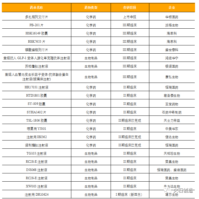 仿制药市场竞争异常激烈,国内创新药研发迎来热潮。在带量采购常态化以及仿制药一致性评价政策下,国内糖尿病仿制药市场竞争进入白热化,热门品种如西格列汀、阿卡波糖均已有十余家企业获批上市,迫使国内企业从仿制药迈向Fast-follow以及First-in-class,除已上市的三款糖尿病国产1类创新药贝那鲁肽注射液、聚乙二醇洛塞那肽注射液、西格列他钠片外,国内药企研发提速,有多款全球领先的创新药已进入临床,如鸿运华宁自主研发的全球唯一两周给药一次且直接作用于GLP-1受体的超长效抗体药物已处于临床Ⅲ期,有望成为新一代超长效降糖和减重治疗药物;道尔生物的全球首创靶向GLP-1受体、GCG受体和FGFR1c/Klothoβ的长效三靶点激动剂DR10624已在国外获批临床,为同类药物中全球首款进入临床开发的品种;华领医药自主研发的多扎格列艾汀是全球首个提交新药上市申请的葡萄糖激酶激活剂类(GKA)糖尿病治疗药物,并有望成为在中国首先上市的全球首创新药,国内企业源头创新实力强劲。