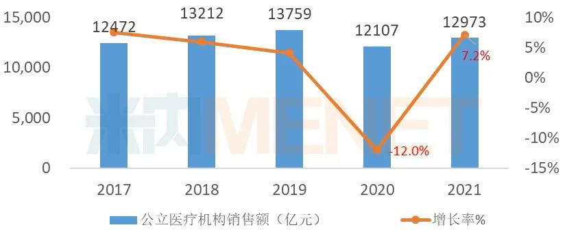 2017-2021年中国公立医疗机构终端药品销售额及增长情况图