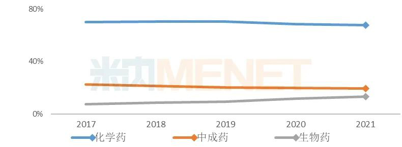 从药物类型分布来看:2021年中国公立医疗机构终端化学药的占比最大,超过65%;其次是中成药接近20%;生物药的占比相对较少,但生物药的市场份额持续上升,市场地位不断提升,且2021年销售额的增速达19.8%,远高于化学药和中成药的增速。