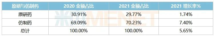 2021年中国公立医疗机构终端原研药与仿制药的占比及同比增长情况分布表