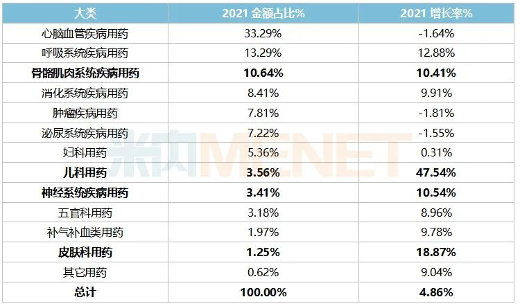 从2021年化学药(含生物药)各治疗类别的销售额的同比增长情况看:各治疗类别的药品均呈现不同幅度的增长。其中增长幅度达到10%以上的治疗类别主要来源于两种类型的领域:一类是市场中患病人群不断上升但现有药品尚未完全满足需要,且近两年有新的生物药上市的品类如抗肿瘤及免疫调节药、感觉系统药物、皮肤病用药以及全身用激素类制剂(不含性激素和胰岛素)等;另一类是因新冠疫情影响减少而医疗机构诊疗人数增加带来对药品需求增加的品类(如呼吸系统用药、杂类等)。增长幅度较低的品类主要为受国家相关政策影响较大的治疗领域:如受国家集采影响的主要品类有消化系统及代谢药、心血管系统药物等;受抗生素限售影响的全身用抗感染药物;受国家重点监控用药目录影响的神经系统药物。