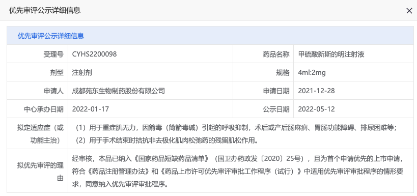 新斯的明为抗胆碱酯酶药物,由日本盐野义株式会社研发,最早于 1936 年 10 月在日本上市。据 Insight 数据库 显示,当前国内已有 12 家企业正在布局新斯的明的注射剂剂型,其中,7 家已经获批,另有 3 家正在上市申请中。