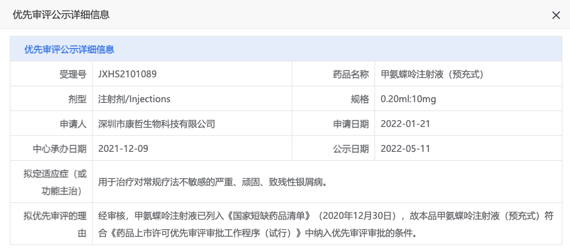 甲氨蝶呤注射液(预充式)是多种规格的低剂量甲氨蝶呤(MTX)注射剂。该产品已被 NMPA 公布为参比制剂(RLD),且已获得欧洲药品管理局总部(HMA)批准上市。有望成为中国首个以皮下给药治疗银屑病的甲氨蝶呤药物,满足银屑病患者基础治疗的用药需求。