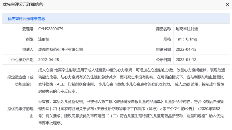地高辛是临床常用的强心苷类药物,能减慢心率,有效改善心力衰竭症状和心功能,降低严重充血性心力衰竭患者的住院率并缩短其住院时间,临床常用于治疗心力衰竭、心房颤动及其他心律失常等。此前于 4 月 19 日,成都倍特药业的地高辛片刚刚首家过评。