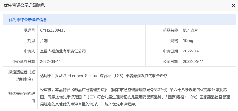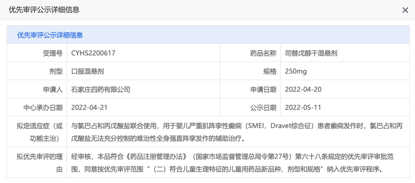 拟定适应症(或功能主治):与氯巴占和丙戊酸盐联合使用,用于婴儿严重肌阵挛性癫痫(SMEI,Dravet综合征)患者癫痫发作时,氯巴占和丙戊酸盐无法充分控制的难治性全身强直阵挛发作的辅助治疗。