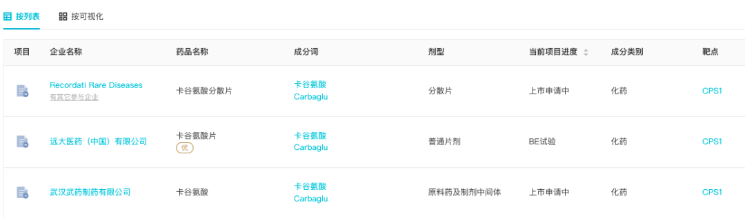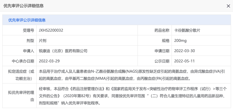 卡谷氨酸是一款罕见病药物,最初在海外被批准用于 N-乙酰谷氨酸合成酶(NAGS)缺乏症引起的高氨血症,也是 FDA 批准的第一个用于治疗因 PA 或 MMA 引起的急性高氨血症的药物。
