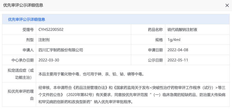 拟定适应症(或功能主治):本品主要用于氰化物中毒,也可用于砷、汞、铅、铋、碘等中毒。