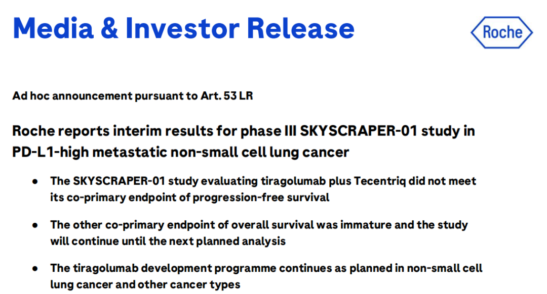 尽管如此,罗氏将继续在III期关键试验SKYSCRAPER-01和SKYSCRAPER-03中研究tiragolumab在非小细胞癌(NSCLC)治疗中的应用。
