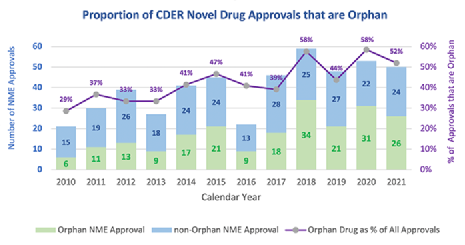 在过去十年左右的时间里,我们看到用于治疗罕见或“罕见”疾病的药物比例呈上升趋势。去年,CDER批准的50种新药中有26种——超过一半——是治疗孤儿病的。