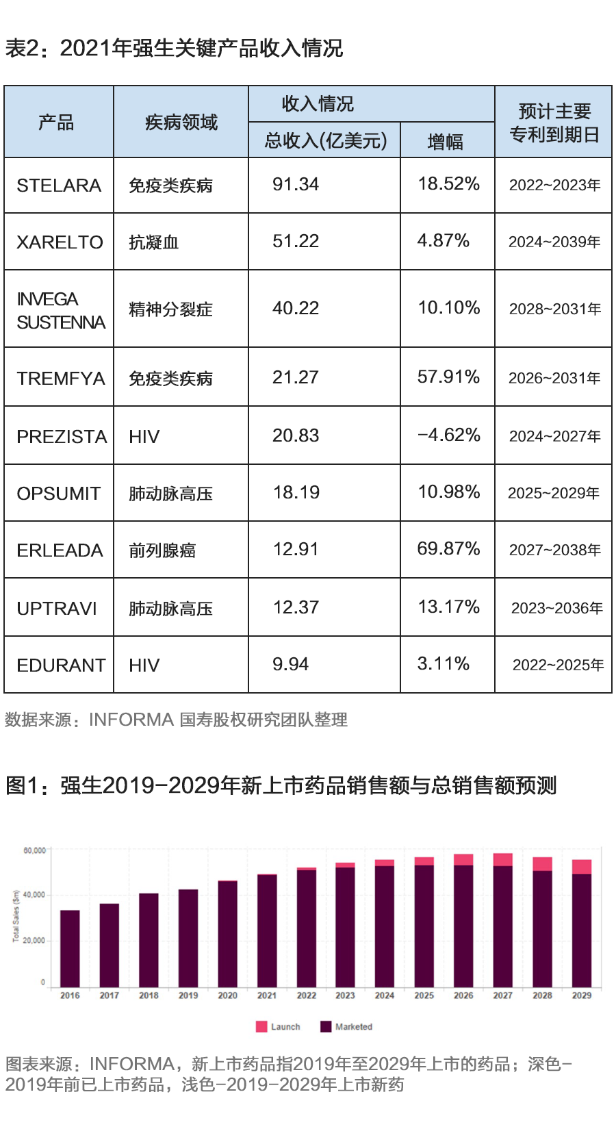强生已采用多种手段来应对本次挑战,但后续管线相对薄弱。当前,强生销量最好的两款肿瘤新药Darzalex(兆科)、Imbruvica(依鲁替尼)2021年全球销售额分别为60.23亿美元、43.69亿美元,未来预计将保持5%-10%的年增长率,弥补空间有限。此外,公司后续管线也缺少爆款新药,预测显示到2030年,强生10年内新上市药年销售额仅60亿美元,如无重磅药品上市,将无法填补此次“专利悬崖”带来的空缺。