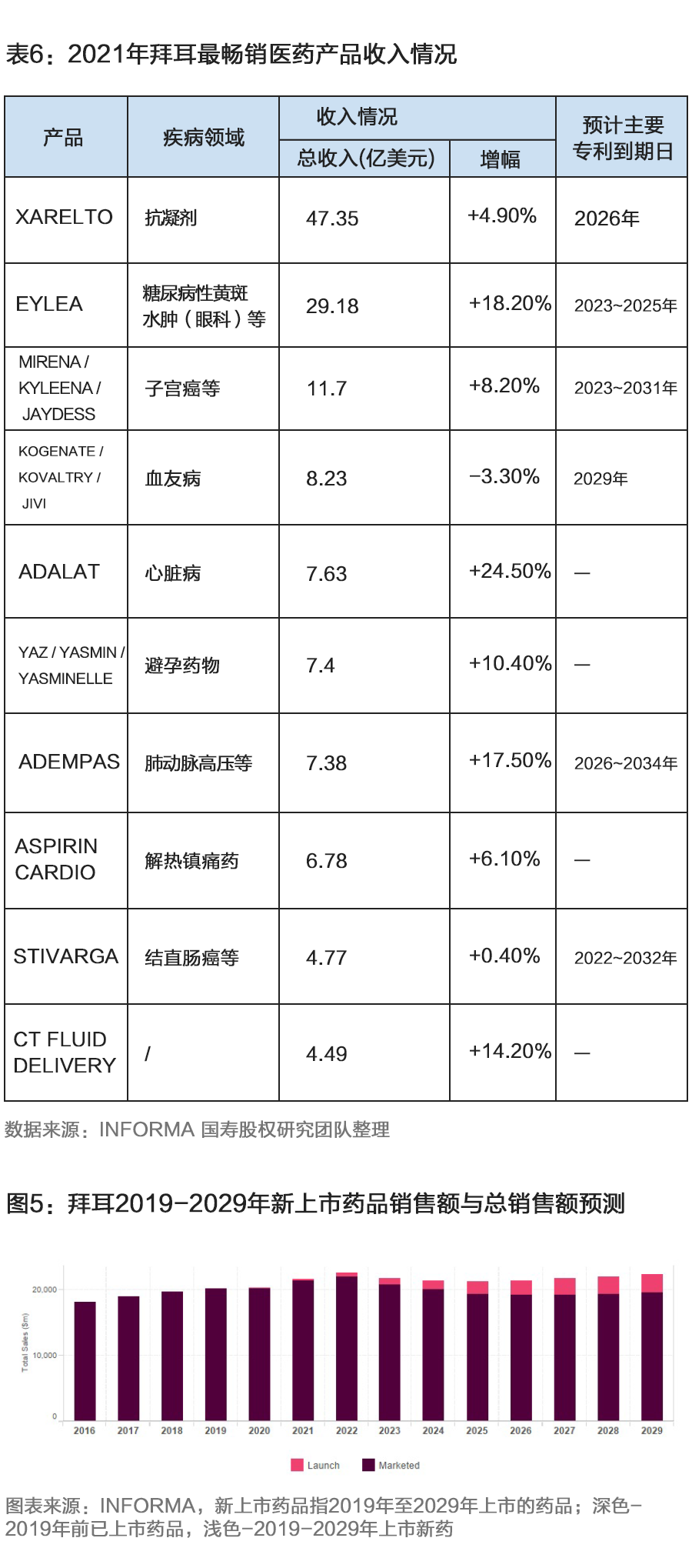 2021年,拜耳最畅销的两款药品口服抗凝药Xaralto和眼科药物Eylea分别实现47.35亿欧元和29.18亿欧元销售收入,合计占制药部门销售收入41.70%、占拜耳总收入17.36%。2023-2026年前,Xaralto、Eylea核心专利将陆续到期,且当前多款仿制药已进入研发后期,拜耳面临严峻挑战。