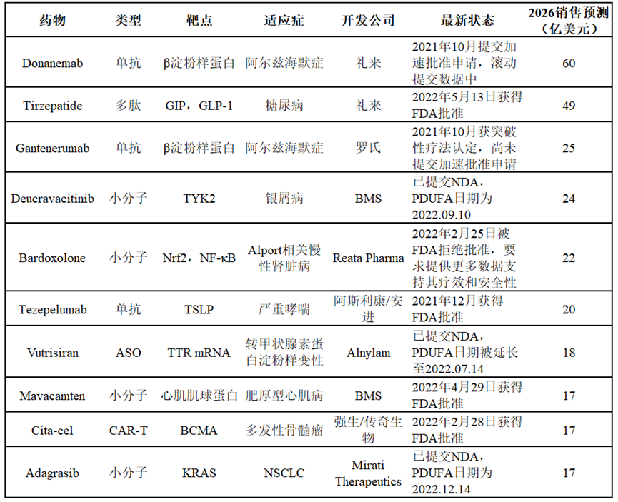 FiercePharma根据Evaluate Pharma的报告《Evaluate Vantage 2022 Preview》,分析了2022年最令人期待的十大将上市新药。截至2022年5月14日,已有4款获得批准,1款因疗效证据不充分被拒绝批准。这10款新药中有4个小分子,3个单抗,1个细胞疗法,1个RNAi疗法,1个多肽,适应症包括阿尔兹海默病、非小细胞肺癌、糖尿病等。根据预测,这十款新药在2026年的销售总额预计将达到269亿美元,其中礼来的Aβ单抗预测销售额最高,可达60亿美元。