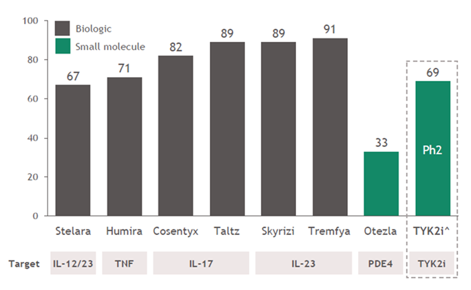 银屑病的II期临床试验数据显示,与安慰剂和阳性对照相比,Deucravacitinib在PASI 75和sPGA 0/1评估的皮肤症状清除率、生活质量指标等方面均表现明显改善。患者响应率为69%,明显优于同为小分子口服药的重磅炸弹Otezla,接近IL-12/23单抗Stelara和药王Humira。但TYK2为JAK激酶的亚家族之一,FDA不排除将要求Deucravacitinib添加黑框警告。虽然Deucravacitinib为TYK2的变构抑制剂,与所有获批的JAK抑制剂作用机制均不同,且未在临床试验中发现患者癌症和心脏病风险增加,但BMS仍需要进行大规模的上市后研究来使其安全性变得更有说服力。目前BMS已提交Deucravacitinib的NDA,PDUFA日期为2022年9月10日。根据Evaluate Pharma预测,其2026年销售额可达24亿美元。
