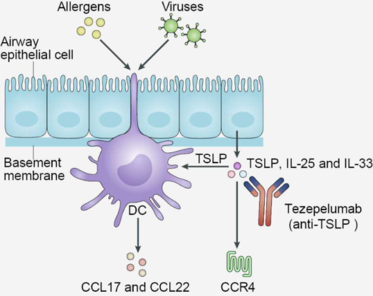 Tezspire由安进和阿斯利康共同开发,是第一款在广泛严重哮喘患者群体中能够持续显著减少病情加重的单克隆抗体。通过结合胸腺间质淋巴细胞生成素(TSLP),Tezepelumab可以阻止TSLP与其受体复合物的相互作用,并抑制多种下游炎症通路,从而减少哮喘的加重率。