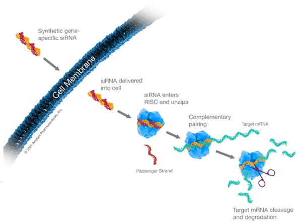 由Alnylam公司开发,是一款皮下注射RNAi疗法,用于治疗遗传性和野生型转甲状腺素蛋白淀粉样变性(ATTR)。Vutrisiran能够靶向并沉默转甲状腺素蛋白的mRNA,阻断野生型和突变型转甲状腺素蛋白的翻译。可帮助减少转甲状腺素淀粉样蛋白在组织中的沉积,促进组织中沉积的淀粉样蛋白清除,并潜在地恢复这些组织的功能。