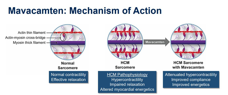 由BMS开发,是FDA批准的第一款心肌肌球蛋白小分子变构调节剂,可抑制肌钙-肌球蛋白结合,阻止肌桥形成,从而改善肥厚型心肌病患者(HCM)的心肌收缩功能亢进,进而改善心肌舒张功能和患者的临床结局。