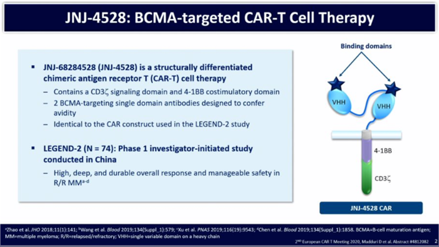 由传奇生物开发,是一款靶向B细胞成熟抗原(BCMA)的CAR-T疗法,包含一个4-1BB共刺激结构域,及两个靶向BCMA的抗体结构域,用于治疗多发性骨髓瘤。