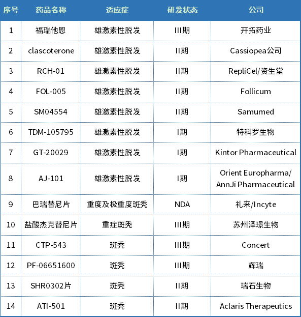 表1不完全统计了目前进入临床阶段的在研管线,针对雄激素性脱发靶点以雄激素受体拮抗剂为主,针对斑秃的靶点以JAK抑制剂为主。