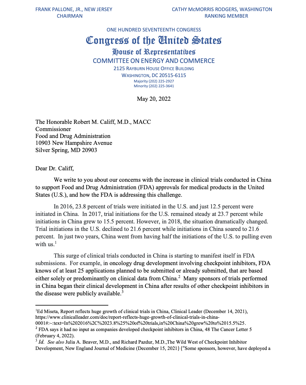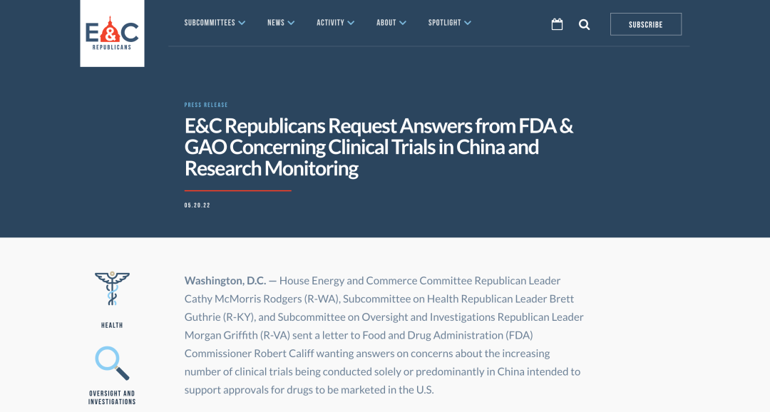 2022年5月20日,美国E&C Republicans网站公布一则新闻,三位共和党人Cathy McMorris Rodgers 、Brett Guthrie和Morgan Griffith联名向美国食品药品监督管理局(FDA)局长Robert Califf发送了一封关于中国临床试验的信函。信中表达了对在美申报上市批准的药物的临床试验,越来越多仅在中国或者主要在中国进行的担忧,希望可以得到解答。 E&C成员提出了下述几项隐忧: