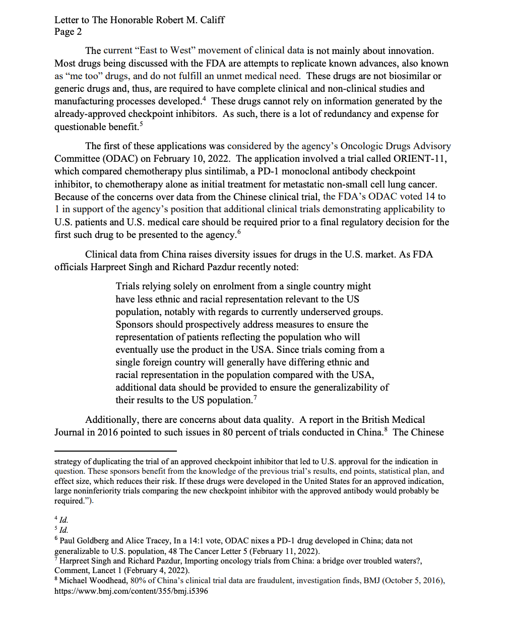 从这封信的态度,明显是要FDA对中国临床试验,采取否定态度。