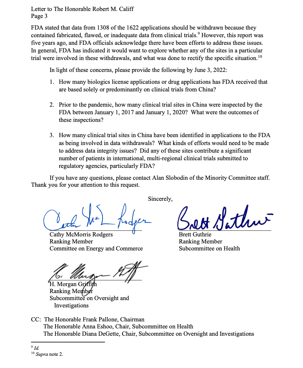 E&C成员要求Califf局长在2022年6月3日之前,回复下述有关在中国进行临床试验的问题。(三位议员给Califf局长的信文末已附)