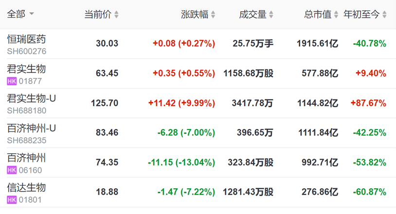5月12日恒瑞、君实、百济、信达股价变动 图片来源|雪球