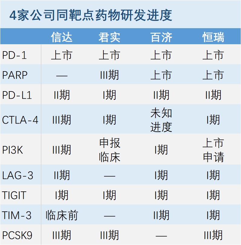 简单整理发现,“四小龙”研发的产品彼此有较多的靶点重合(详见下表),除PD-1抑制剂外,君实与“四小龙”其他公司的地盘争夺还将在PARP、PCSK9等靶点上演,远期来看,TIM-3、LAG-3等也会成为新的战场。而其中多个靶点,君实的产品研发进度都相对落后,因此君实只有牢牢把握住这次机会,在其他产品开发上迎头赶上,才能稳固其市场地位。