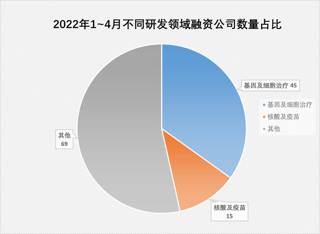 新技术在疫情防控上展现的广阔应用前景,让中国创业公司和风险投资机构加快与其拥抱。今年1~4月,研发客共收集到新药研发相关一级市场融资129项,其中60家企业即近半数的研发方向与CGT(细胞与基因治疗)以及核酸药物及疫苗相关(见下图),它们共募集资金约91亿元人民币。60项融资中处于A轮及之前的早期阶段融资共42项,由此也可看出大量新公司在上述方向涌现并获得资本支持。