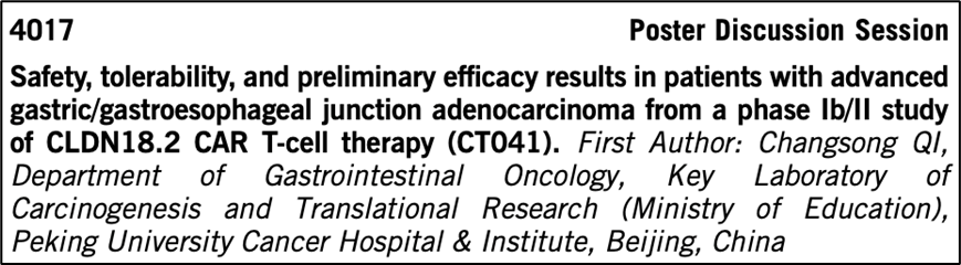 Claudin18.2(CLDN18.2)是一种很有前景的治疗靶点,通常局限于胃粘膜紧密连接处表达,但在胃/胃-食管交界处(G/GEJ)癌中经常过表达。科济药业的CT041是一款靶向CLDN18.2的CAR-T细胞疗法,在临床前研究中显示出良好的抗肿瘤活性。本次临床试验结果共入组14名患者,其中有8例(57.1%)达到部分缓解(PR), 2例(14.3%)患者病情稳定(SD),中位随访时间为8.9个月(95%CI5.91, NE),中位无进展生存期(PFS)为5.6个月(95%CI 1.9, 7.4),中位总生存期(OS)为10.8个月(95%CI 5.1, NE),末次随访时有尚7例患者存活。这些初步结果表明,CT041在既往接受过治疗的晚期G/GEJ癌患者中具有可管理的安全性/耐受性和良好的疗效。目前CT041的II期临床试验正在进行中。