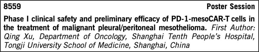 恶性胸膜/腹膜间皮瘤(MPM)是一种侵袭性癌症,其特点是治疗反应低和生存率低,PD-1介导的免疫抑制被认为与实体瘤中T细胞耗竭和功能障碍有关。上海细胞治疗集团构建了一种靶向间皮素并且可以分泌PD-1纳米抗体的CAR-T细胞产品PD-1-mesoCAR-T。6名入组患者的样本间皮素阳性率为50% ~ 100%,其中3例标本PD-L1染色阳性。所有患者在输注前均进行淋巴清除术,有2例(33.3%)患者出现细胞因子释放综合征,分别为1级和3级,4例(66.7%)患者出现发热,2例(25%)患者发生3级肺部感染,5例患者病情稳定大于3个月,1例患者在PET/CT扫描中显示完全缓解,1例患者显示部分缓解。患者的客观缓解率(ORR)为33.3%,而在PD-L1阳性患者的客观缓解率(ORR)为66.7%。对6例恶性间皮瘤患者的临床研究表明,PD-1-mesoCAR-T细胞产品是安全可行的,具有良好的疗效,CAR-T细胞对长期存活的影响将被持续观察。