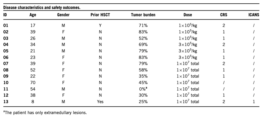 靶向CD19的CAR-T细胞治疗产品显示出对r/r B-ALL非常惊人的疗效,然而某些危及生命的副作用,特别是高分级的细胞因子释放综合征(CRS)和免疫效应细胞相关神经毒性综合征(ICANS)限制了其广泛应用。为了克服这些限制,精准生物建立了一个基于适度激活和短时间扩展的新型PrimeCAR平台,通过此平台制造的自体CD19 CAR-T细胞产品MC-1-50在临床前研究中显示出较好的疗效和较少的细胞因子分泌。在这项I /II期研究(NCT04271410)中,CAR-T细胞由PrimeCAR平台制造,制造周期缩短到大约2天,T细胞用慢病毒载体转导,其中CAR分子使用了人源化CD19 scFv以及4-1BB共刺激结构域。13名r/r B-ALL患者被纳入本次临床试验,疾病特征和结果见下表: