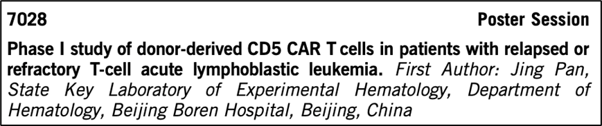 北京博仁医院潘静团队更新了供体来源CD7 CAR-T的临床数据。直到2022年2月14日,20名入组患者中有19名(95%)有响应,中位随访时间为15.8个月(范围13-18.3)。短期不良事件包括3级或更高级别的细胞因子释放综合征(10%)和1-2级移植物抗宿主病(GVHD,60%),但症状都是可恢复的。在5名有响应的患者中发生6起迟发性(输注后30天>)严重不良事件(SAEs)。供体来源的CD7 CAR-T注射后30天的客观缓解率和完全缓解率分别为95%和85%。患者复发的中位时间为6个月(范围4-10.9)。1年无进展生存期(PFS)和总生存期(OS)分别为51.6% (95% CI, 24.7-78.4%)和72.5% (95% CI, 51.9-93.0%)。综合来看,供体来源的CD7 CAR-T细胞产品在治疗r/r T-ALL中显示出令人鼓舞的疗效,但是复发是阻碍长期结果的主要问题。 上述治疗方案会有相当比例的应答患者最终因CD7抗原丢失而复发,因此该团队设计了靶向另一种抗原CD5的CAR-T细胞疗法。超过80%的T-ALL病例细胞中会表达CD5,但是在CD5 CAR-T制备过程中会发生严重的“互杀”现象,因此在对T细胞进行CAR-T修饰的同时也敲除了CD5基因来防止“互杀”现象的发生。5例在CD7 CAR治疗后因CD7阴性复发的患者被纳入研究,所有5例患者在第30天时完全缓解,保持MRD阴性的中位随访时间为2.7(范围为1.8-4.1)个月,CD5阳性健康T细胞的减少是常见的现象,因此需要更长的随访评估来确定持久缓解能力和功能性免疫系统重建问题。
