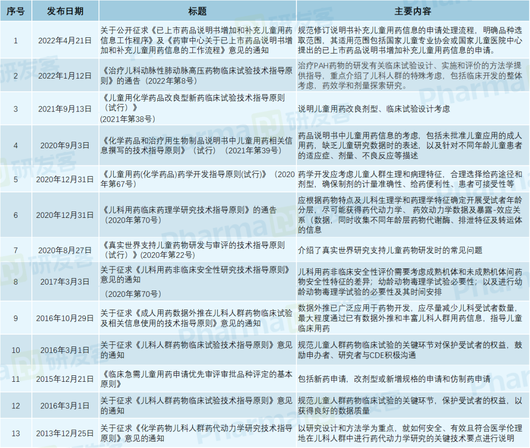 根据研发客的统计,自2013年底以来,CDE共发布了12项与儿童用药相关的指导原则(见下表)。