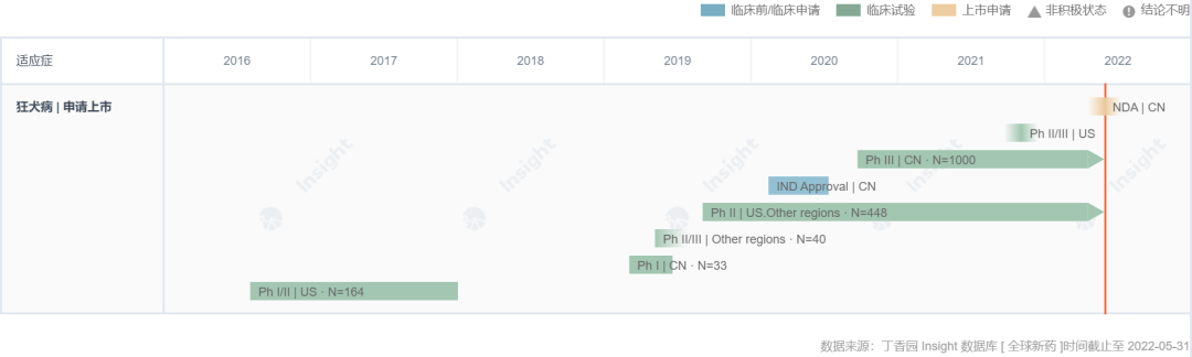 本次上市申请是基于中国 III 期临床试验,研究数据显示截至目前所有受试者用药后的保护率为 100%(即无狂犬病死亡率),SYN023 试验组用药后第 8 天 RVNA(狂犬病毒中和抗体)几何平均滴度远高于 HRIG 对照组,达到全部主要疗效终点以及安全性终点要求。