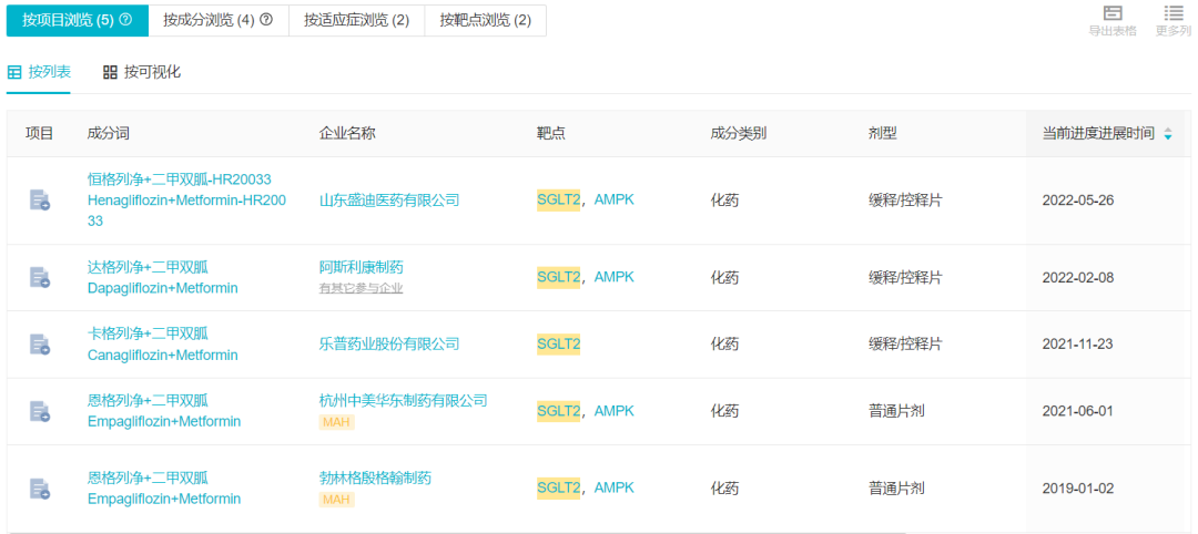 目前据 Insight 数据库 显示,同类药物中勃林格殷格翰的恩格列净二甲双胍和华东医药的仿制药已经在国内获批上市,不过均非缓释剂型。缓释剂能够减少用药次数、简化降糖疗法,预期能够提高患者的治疗依从性。在本次恒瑞申报之前,国内乐普医药首家申报了卡格列净二甲双胍缓释片,阿斯利康也申报了达格列净二甲双胍缓释片。