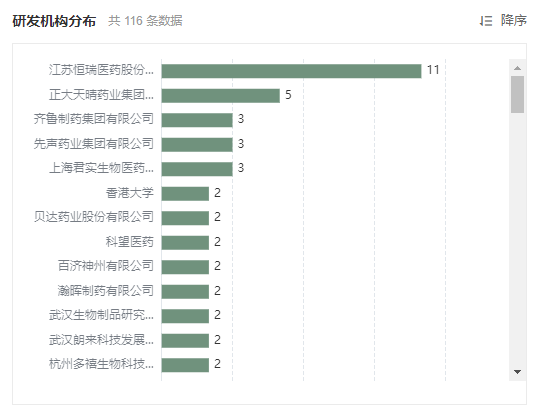 从研发机构分布来看,5 家企业在本月有超过 3 个项目开发阶段发生新变动,分别是恒瑞医药、正大天晴、齐鲁制药、先声药业和君实生物。