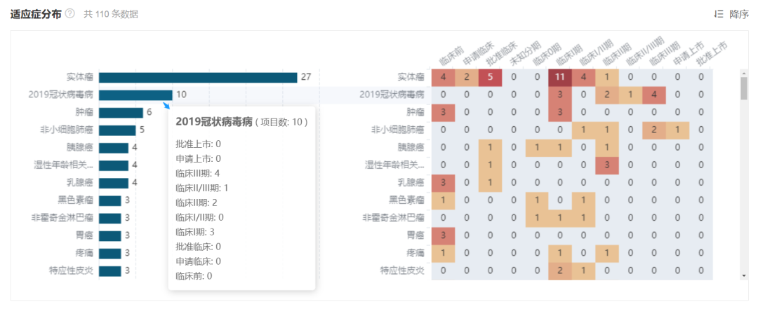 从新药项目适应症分布来看,肿瘤(包括实体瘤及其他下级适应症)毫无意外占据绝大部分。不过仅次于肿瘤,新冠相关药物正在高速增长着,而疫苗在其中占据了绝大多数,针对 Omicron 毒株疫苗、mRNA 疫苗各显神通。