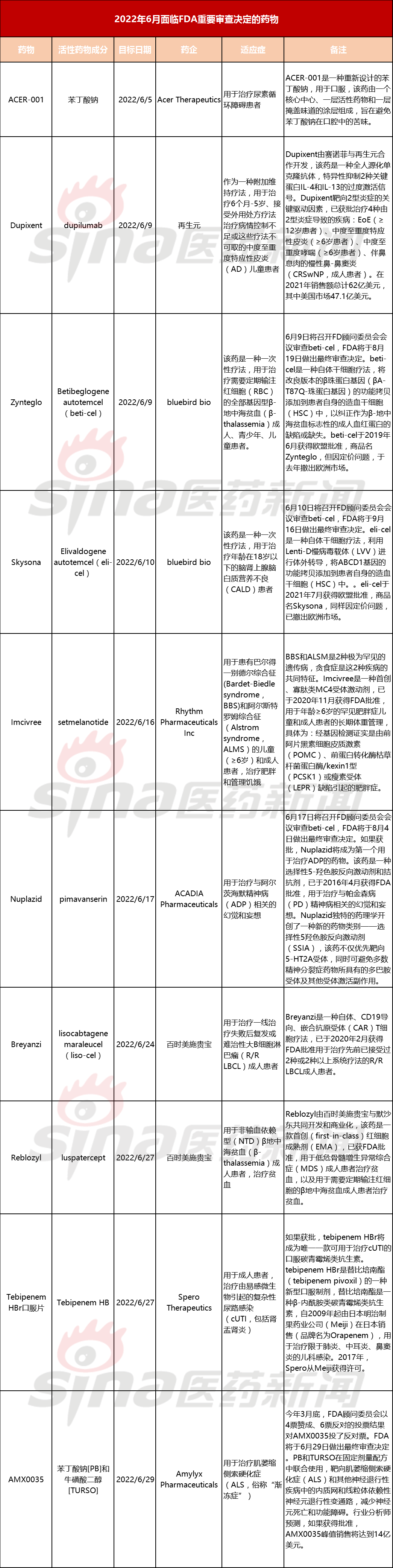 进入6月份,有多款药物将迎来FDA的重要审查决定。以下是对这些药物进行的简单汇总: