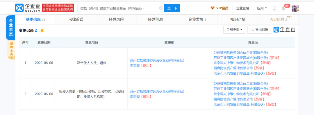 企查查消息显示,6月6日,维梧(苏州)健康产业投资基金(有限合伙)发生工商变更,原股东李奕璇退出,新增北京科兴中维生物技术有限公司、招商财富资产管理有限公司、苏州工业园区产业投资基金(有限合伙)、北京市大兴发展引导基金(有限合伙)等多名股东。