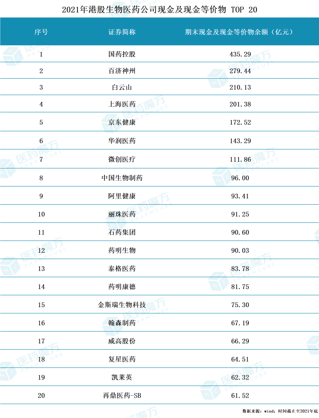 对于港股上市公司,国药控股、上海医药、华润医药等“国家队”的现金实力尤为引人瞩目,分别位列现金榜单的榜首、第4位及第6位。